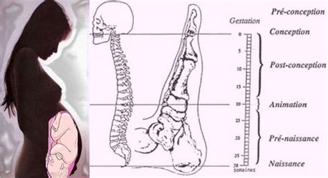 Durant cette période prénatale, la colonne vertébrale du fœtus, placée contre la paroi de l’utérus, mémorise toutes les influences intérieures et extérieures de la mère et absorbe toutes ses émotions : joie, colère, tristesse, peur qu’elle a ressenties.